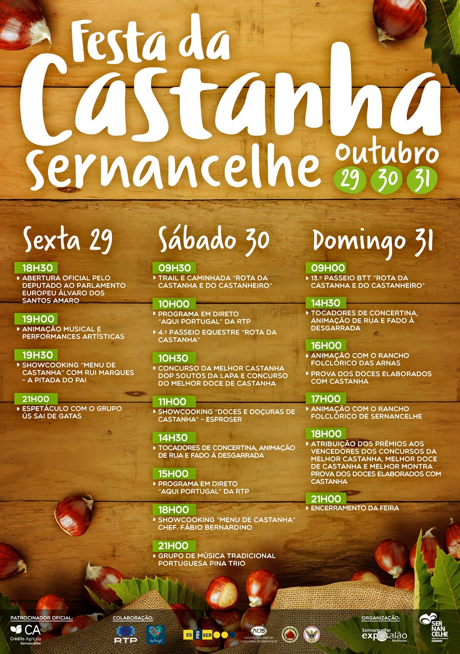 A Festa da Castanha de Sernancelhe decorre de 29 a 31 de Outubro no Exposalão Multiusos, tendo a abertura oficial marcada para sexta-feira, dia 29, ao final da tarde (18 horas 30), com a presença do deputado ao Parlamento Europeu Álvaro dos Santos Amaro.